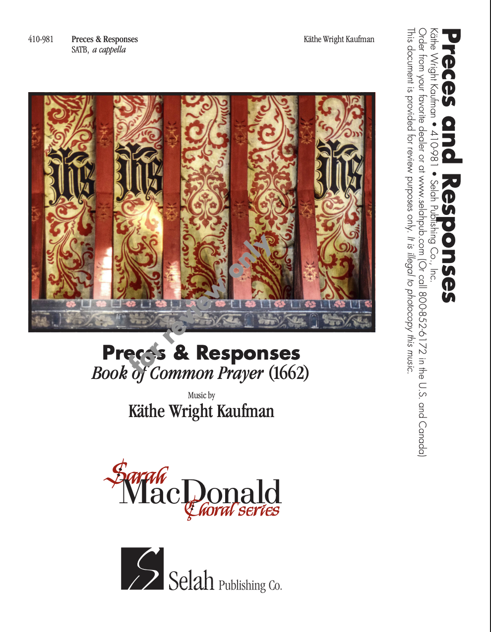 "The conventional incipits from the officiant are answered by rhythmically active, harmonically adventurous responses in this strong set written for the 2022 RSCM America Carolina Course directed by AAM member Robert Poovey. In several responses, Kaufman surprises the ear with unexpected tonal destinations, yet the cadences never feel contrived. Measures with asymmetric meter increase the element of spontaneity and unpredictability, and they may require additional rehearsal time and attention." --AAM Journal, July-August 2023